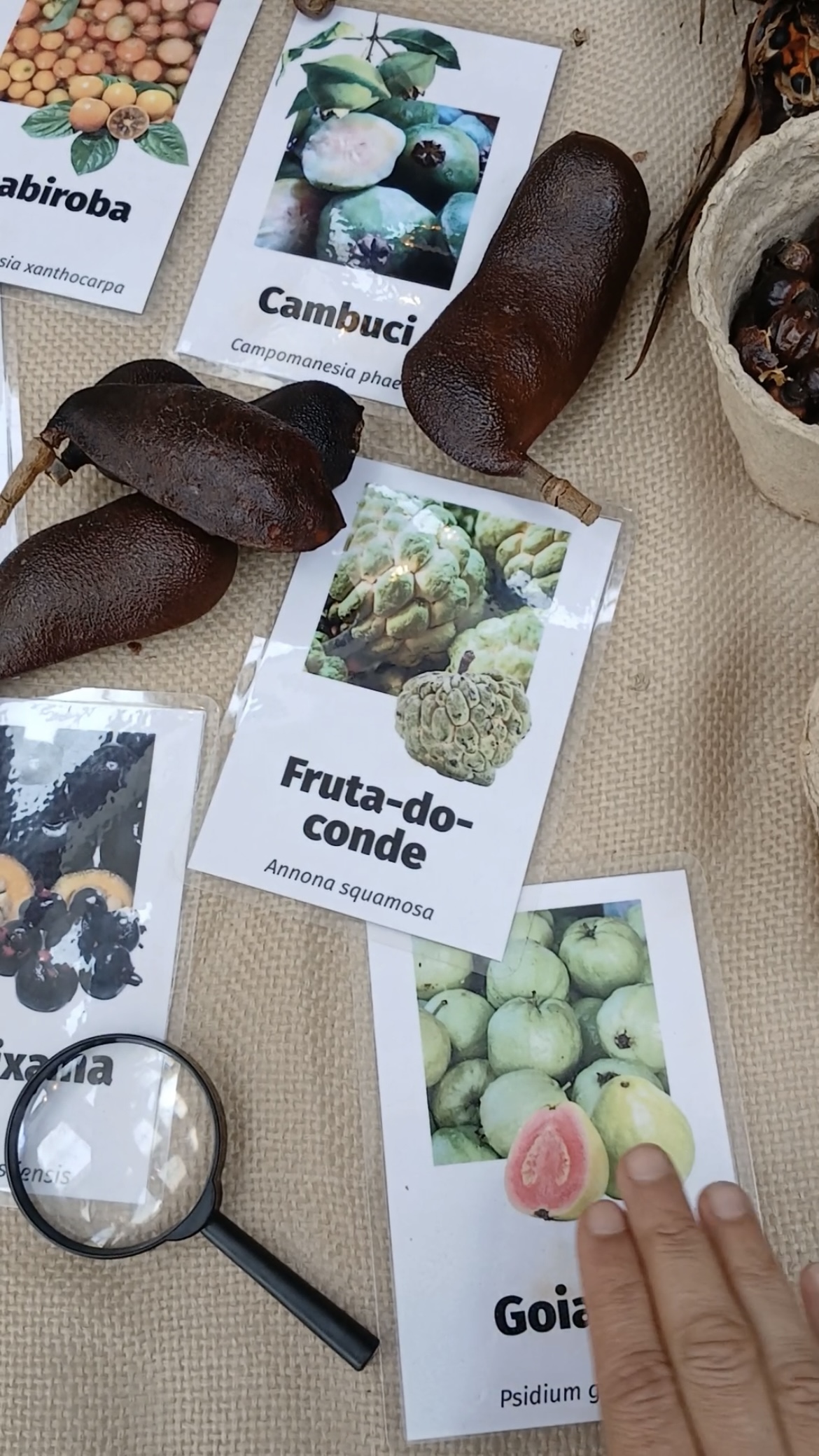 Ao final, todos recebem mudas como brinde, incentivando o cultivo dessas espécies em casa e fortalecendo a conexão com o bioma.