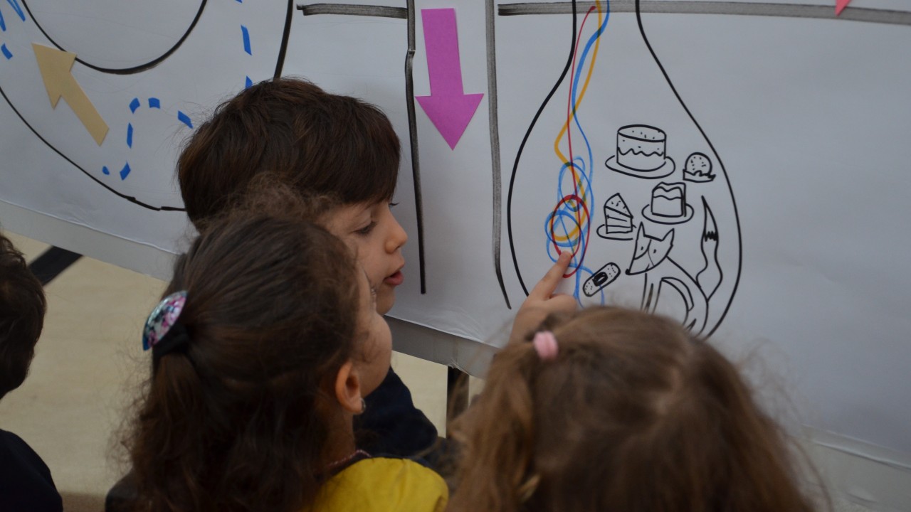Antes de chegar a BVL, alunos do Colégio Renascença, localizado no bairro Barra Funda, em São Paulo, fizeram atividades relacionadas ao livro, mas sem ter contato direto com a publicação, sem ver as imagens. A ideia era instigar a imaginação sobre o tema. A turma da professora Renata Gross, de crianças com 3 anos, fez brincadeiras corporais e pesquisou o significado da palavra seta. Aqueles com 4 e 5 anos, coordenados pela professora Luciane Elkrief, se reuniram em roda para conversar sobre o que poderia haver em suas “cidades ideais”. “Neste semestre, estamos trabalhando com um projeto literário que envolve diferentes estilos narrativos e até a produção de um livro coletivo”, diz Luciane.