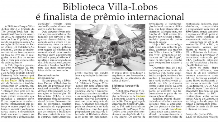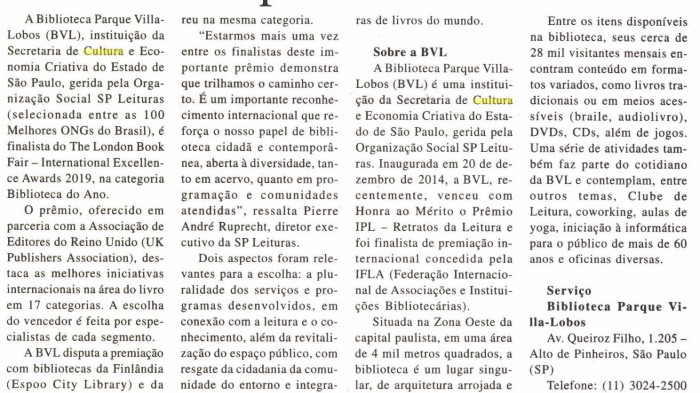 A BVL, instituição da Secretaria de Cultura e Economia Criativa do Estado de São Paulo, gerida pela SP Leituras (selecionada entre as 100 Melhores ONGs do Brasil), é finalista do The London Book...