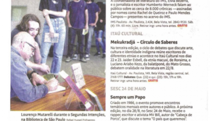 Matéria especial sobre os eventos que permitem encontrar escritores publicada no Guia Folha, da Folha de S. Paulo, inclui o Segundas Intenções. O encontro, que aproxima leitores e autores na BSP (...